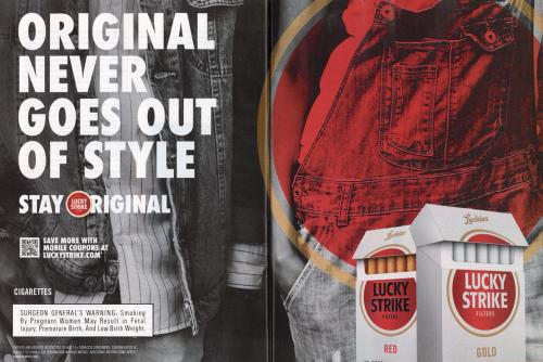 Lucky Strike 2 page ad promoting their original gold and red packs, with a nostalgic denim theme, with the text: "Original never goes out of style." Directs the viewer to the brand website for coupons via a URL or QR code.