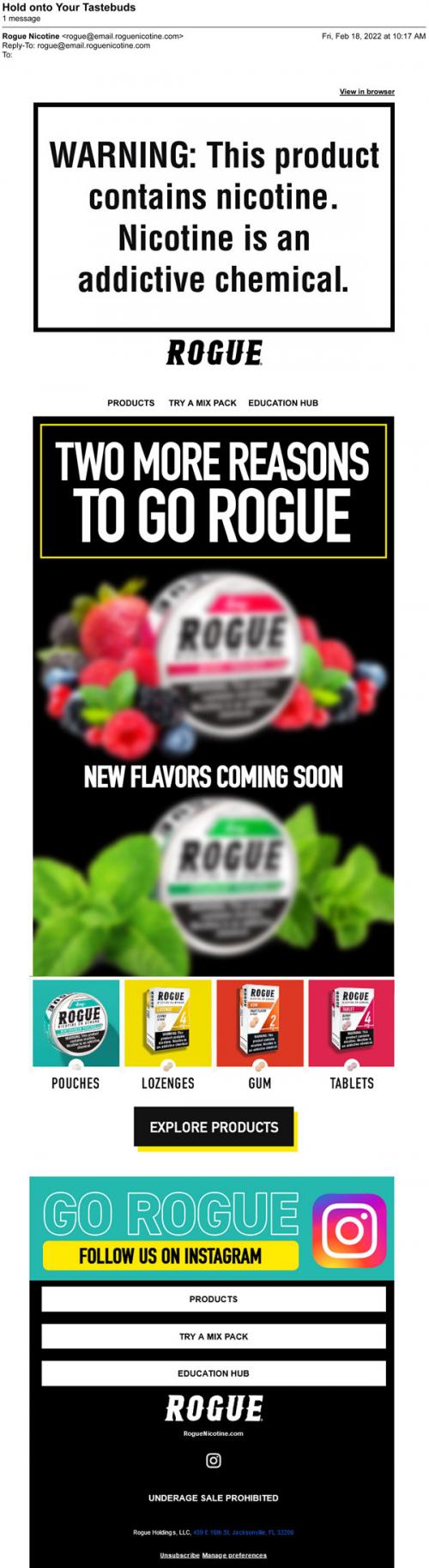 Email from Rogue received in February 2022 promoting two new flavors of their nicotine pouches; from visual cues the flavors could be a berry and a mint, although the images are blurred.