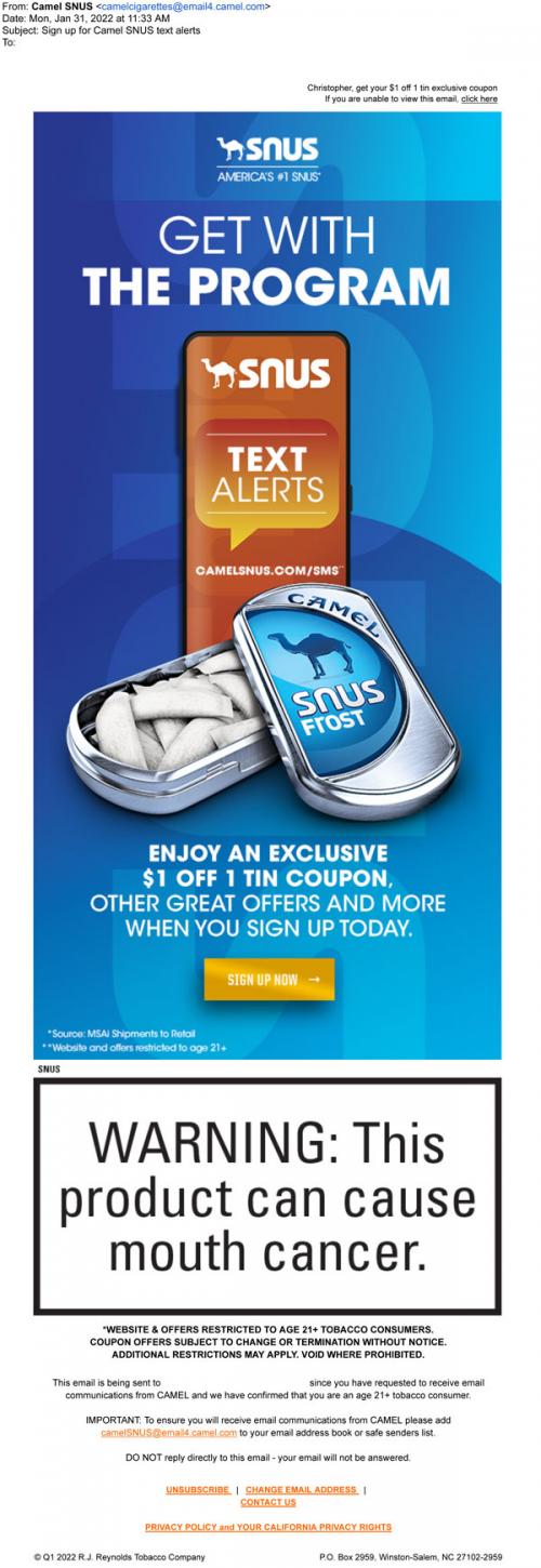 Camel email received in January 2022 promoting a new text alert program for their Camel Snus products. Promises an exclusive coupon for signing up for the service.