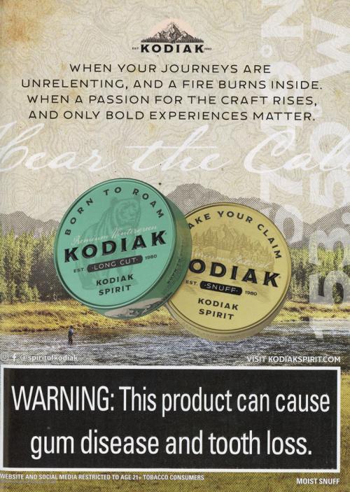 Ad for Kodiak snuff and long cut, with a mountain vista and someone fishing in a river. Text: "When your journeys are unrelenting, and a fire burns inside. When a passion for the craft rises, and only bold experiences matter."