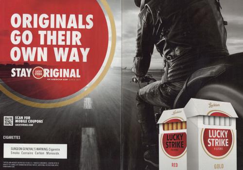 2 page ad promoting Lucky Strike with the image of a person riding a motorcycle and the copy, "Originals go their own way." Includes a QR code to scan and claim coupons.