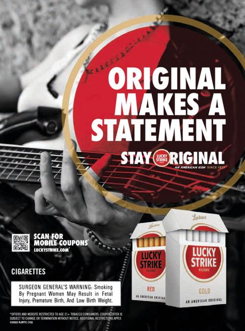 Magazine ad for Lucky Strike featuring an image of someone playing guitar with the copy, " Original makes a statement." Includes a QR code to scan for coupons.