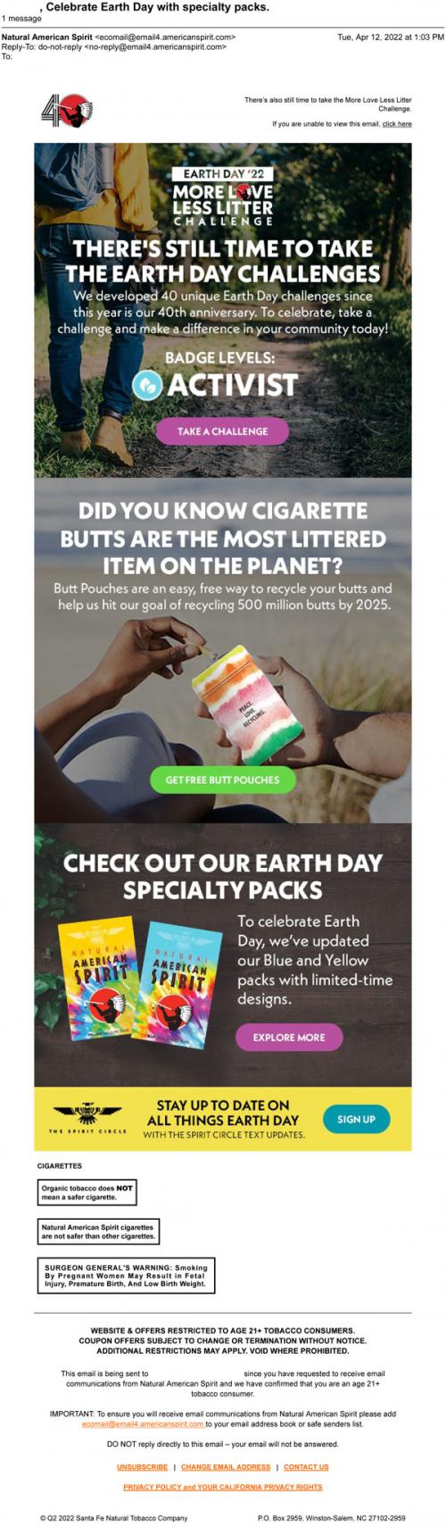 Email from American Spirit in April 2022 reminding the recipient to participate in the More Love Less