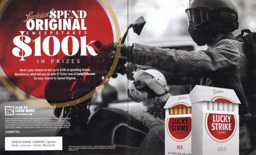 2 page Luckies ad promoting the Spend Original sweepstakes. The ad directs the viewer to enter on the brand website for the chance to win $10k. Image shows someone on a motorcycle with a dog.