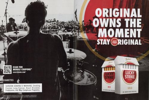 2 page magazine ad continuing Lucky Strike's "Stay Original" series. Shows the scene of a concert from behind the drummer on stage. Includes a QR code to scan for mobile coupons. Text: "Original owns the moment"