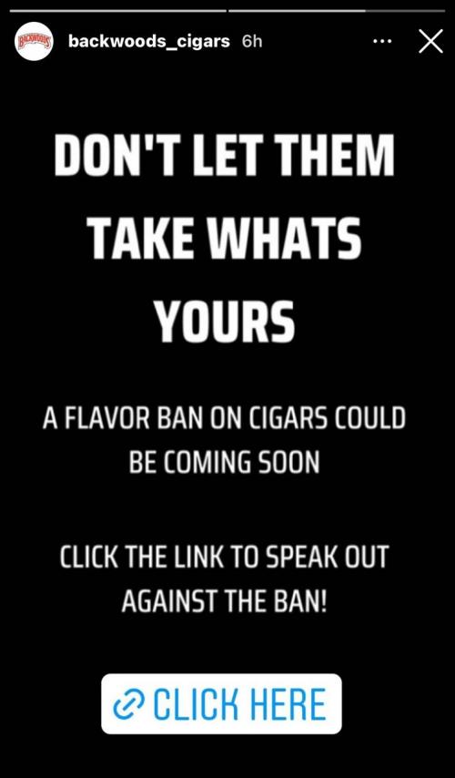 Instagram story posted by Backwoods in June 2022 linking to a form for viewers to send a comment to the FDA against a cigar flavor ban. Text: "Don't let them take whats yours"