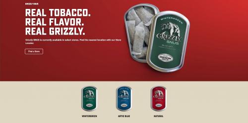 Screenshot from the Grizzly brand website in June 2022 that describes their new snus product and includes a store locator to find the limited stores for the product launch. Has images of the flavors available and links to descriptions: wintergreen, arctic blue, and natural.