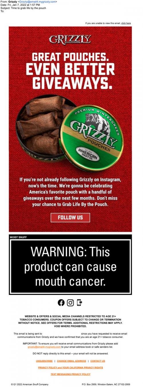 An e-mail from Grizzly received January 2022, encourages the recipient that it is "time to grab life by the pouch." Promotes the the chance to win giveaways: "Great Pouches. Even better giveaways." Uses text to invite the recipient to the brand's Instagram and a button linked to follow the brand's moist snuff website.