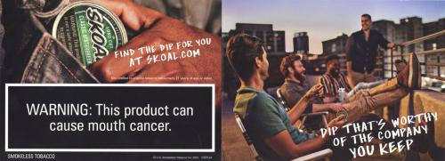 Direct mail received from Skoal in December 2021 promoting their dip as a quality product and showing various images of guys hanging out together. Text: "Dip that's worthy of the company you keep"