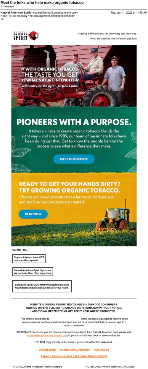 Email from American Spirit in January 2022 with a link to a new feature on the website introducing the people behind the brand's organic tobacco manufacturing process, from farmers to crafts-people. Related, there is also a "choose your own adventure" story visitors can click through that details the tasks related to these manufacturing jobs .