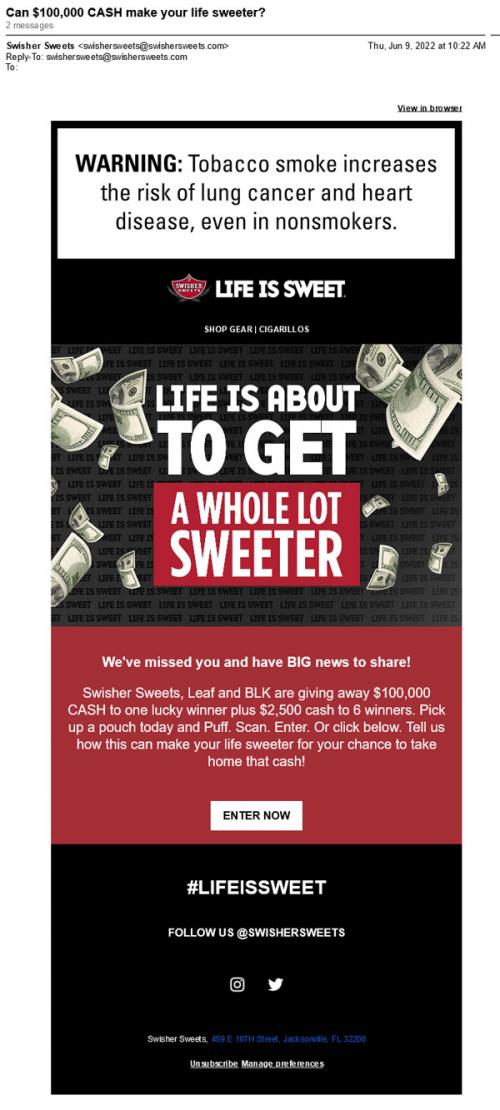 An e-mail June 2022 from Swisher Sweets, promoting "life is about to get a whole lot sweeter" to the recipient. The brand encourages the viewer to enter the chance to win cash from Swisher Sweets, Leaf and BLK. Includes the "life is sweet" hashtag, along with details of following the brand's social media on Instagram and Twitter.