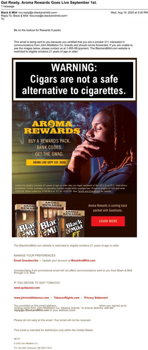An e-mail from Black & Mild, encouraging the customer to be on the lookout for Aroma rewards. The text says " Buy a rewards pack. Bank codes. Get the swag," starting September 1st, 2020. Displays swag imagery of a Black smoking the brand's cigar. The e-mail also shows a variety of packs for purchase, from pipe-tobacco cigars to filter tip cigars.