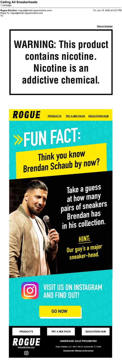 An e-mail from Rogue June 2022, calling all sneakerheads to visit the brand's Instagram page to learn more about Brendan Schaub and his collection. As well as hyperlinks/buttons as the top and bottom to the brand's products, mix packs and education hub.