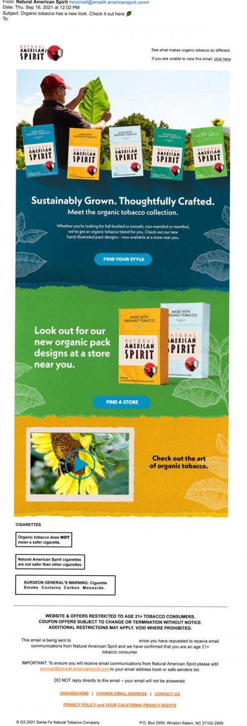 An e-mail from Natural American Spirit September 2021, promotes to the recipient to check out the brand's organic tobacco and new look here. The text informs,the brand's process is "sustainably grown. thoughtfully crafted." Encourages the viewer to their style, with the brand's variety of blends including non-menthol and menthol. Also has buttons to find a store near you carrying Natural American Spirit. The brand has a video available to the customer to look at the "art of organic tobacco."