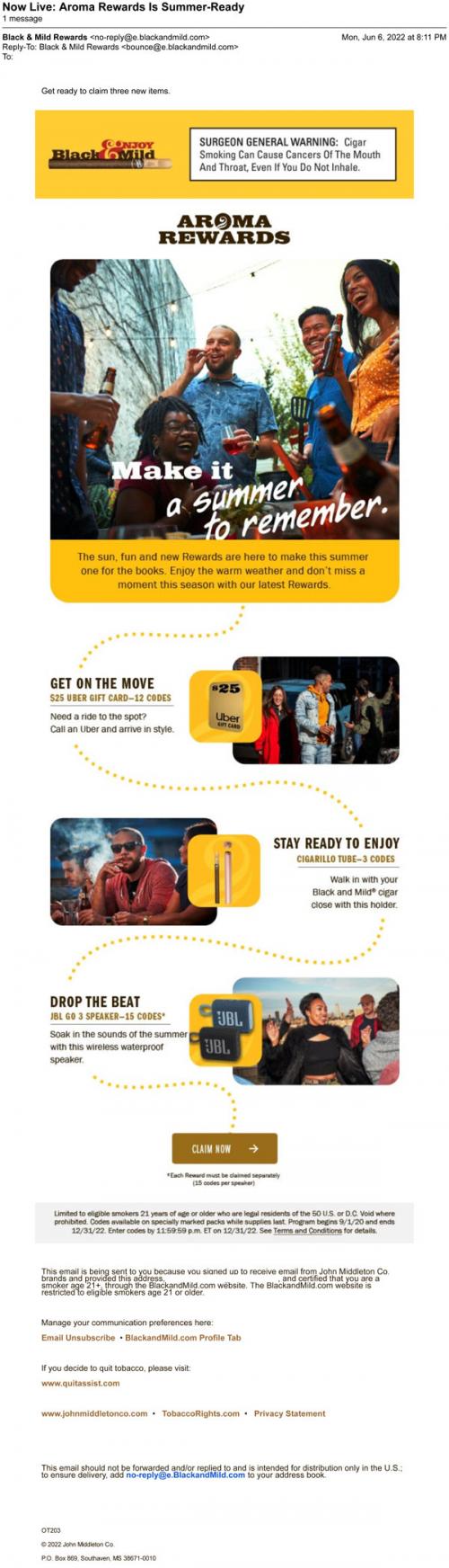 In an e-mail from Back & Mild on June 2022, the viewer is encouraged to claim the brand's latest and new rewards to "make it a summer to remember." The background shows a diverse group of races and genders laughing and having fun as well as drinking alcohol and smoking cigarillos.The recipient can use a linked button to claim three new items: $25 Uber gift card, a cigarillo tube holder, and JBL Go 3 waterproof speaker by reaching a certain number of codes.