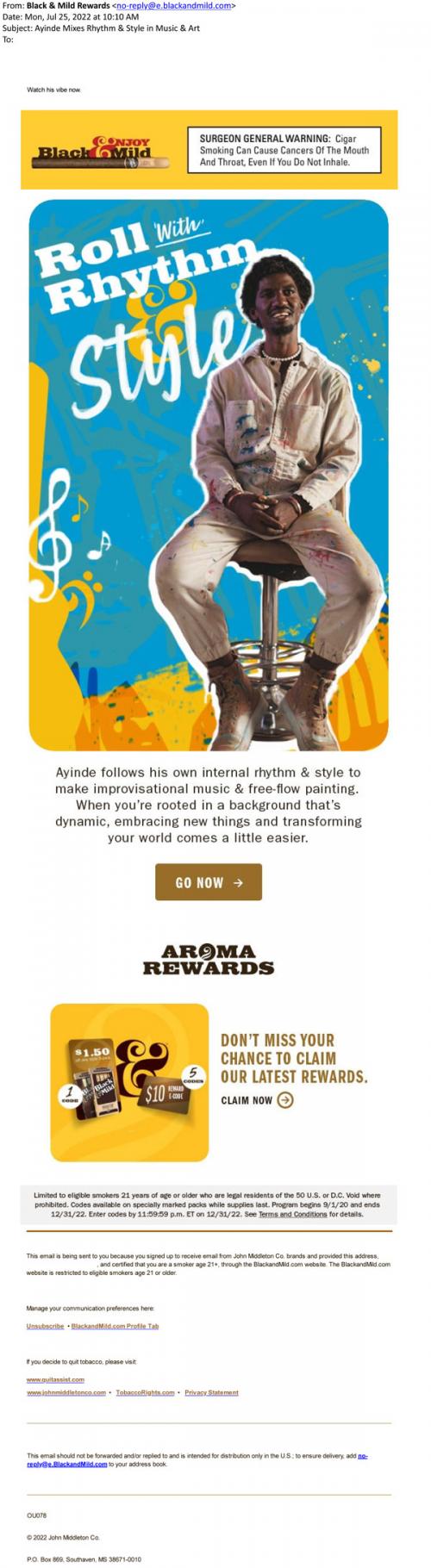 In an e-mail from Black & Mild, the customer is urged to roll with rhythm and style. It also has a linked button to follow Ayinde internalize his own rhythm and style into improvisational music and painting. The text says embracing new and dynamic things can transform the recipient's world a little easier. The brand invites the consumer a chance to claim their latest rewards at the bottom and earn a $10 reward e-code and any style pack for the price $1.50.