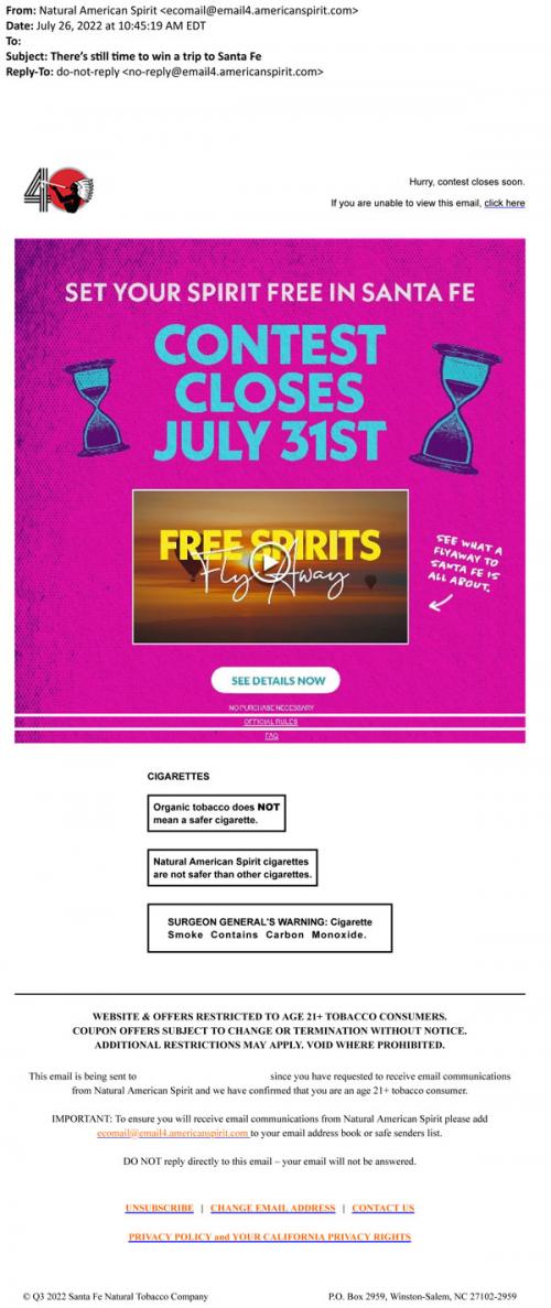 An e-mail from Natural American Spirit July 2022, offering the recipient to set their spirit free in Santa Fe. The brand reminds the viewer there is still time to enter the contest until July 31st to win a trip to Santa Fe. Displays a video of what Santa Fe is all about by showing imagery of hot air balloons flying in the sunset. Links a button to see details.