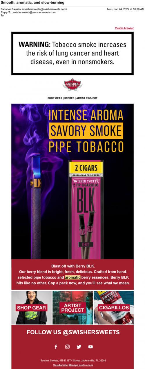 An e-mail from Swisher Sweets January 2022, introduces the smooth, intense aromatic and slow-burning pipe-tobacco to the recipient. Highlights the brand's savory smoke cigarillos and describes the essence of the berry blk blend. Also provides access to shop Swisher Sweets gear and learn more about an artist project. Urges the customer to follow the brand's social media platforms on Facebook, Instagram, Twitter and YouTube.