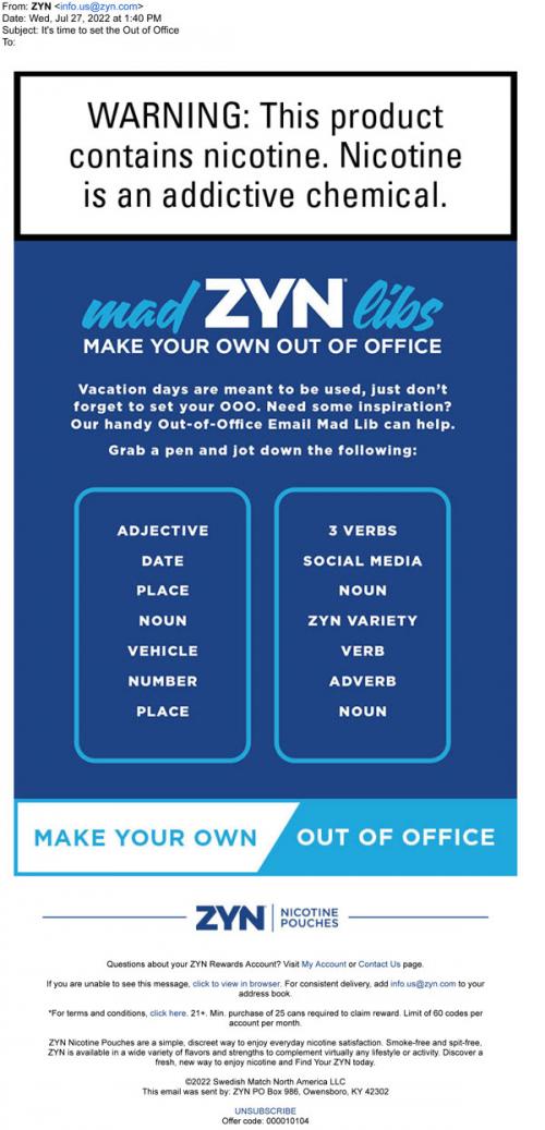 An e-mail from ZYN July 2022, urging the recipient to set the Out of Office. The brand gives their Out-of-Office Email Mad Lib to guide the consumer to make their own out of office vacation inspiration. Includes an activity to jot down ideas for vacation days to be used while also incorporating ZYN variety in the mix.