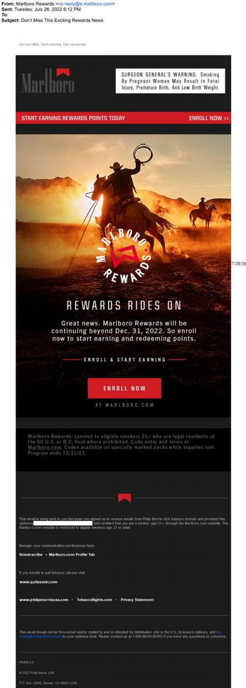 An e-mail from Marlboro July 2022, urging the recipient not to miss the brand's exciting rewards news. Marlboro expresses their continuation of rewards beyond December 31st, 2022. Encourages the viewer to enroll and start earning rewards through access to the brand's website. The background displays imagery of a glowing cowboy on a horse riding in the mountains and nature.