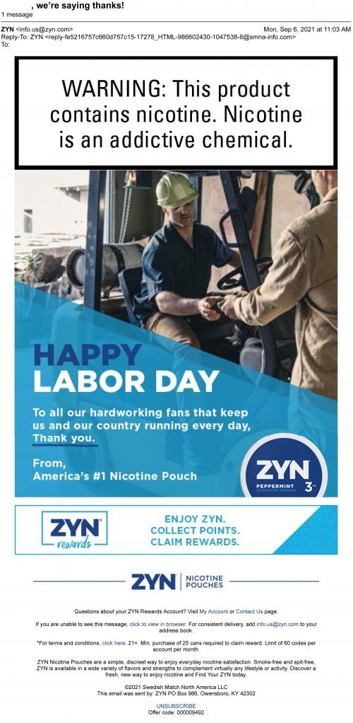 An e-mail from ZYN September 2021, saying happy labor day to the recipient and a thank you to those who are keeping this country up and running. The background shows two construction men at work using nicotine pouches along with ZYN's peppermint flavored pack displayed below. The text also encourages the viewer to use America's #1 nicotine pouch, "Enjoy ZYN. Collect Points. Claim Rewards."
