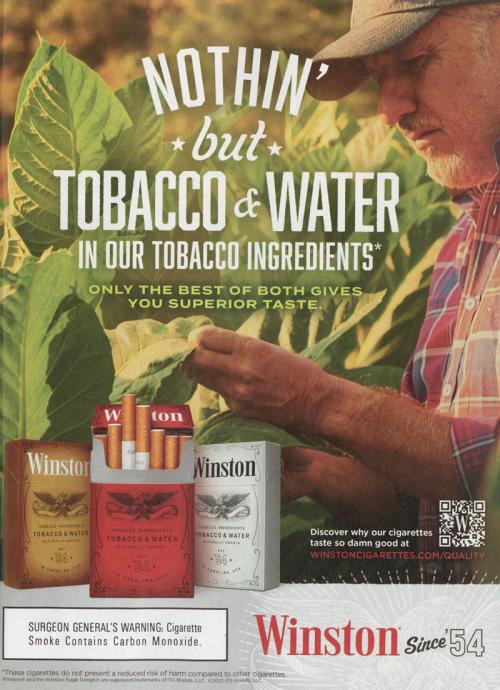 Winston magazine ad mimicking a Natural American Spirit ad, promoting their products as "superior taste." Includes an image of a farmer inspecting tobacco leaves.