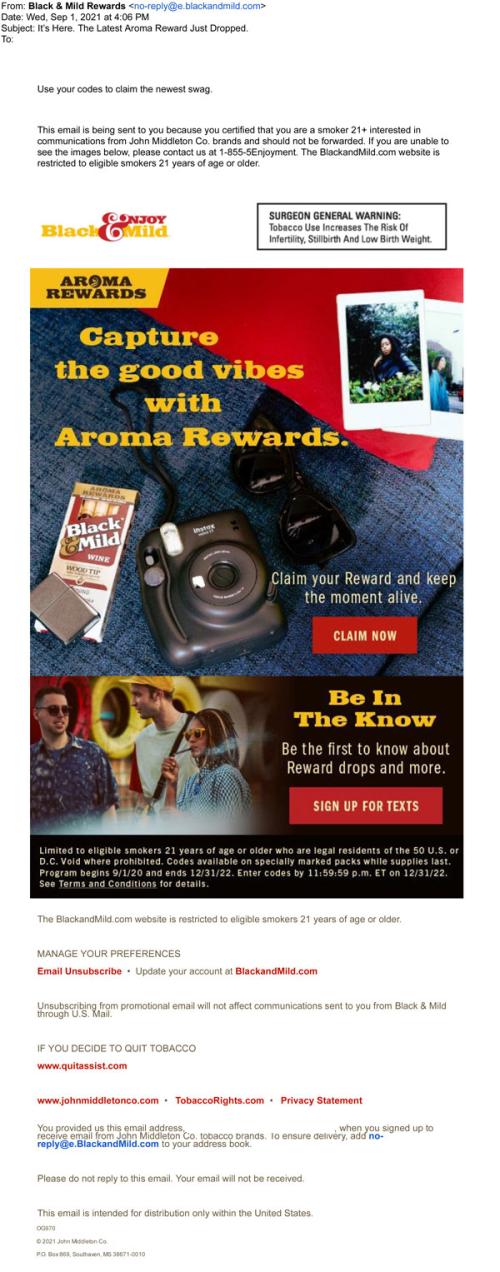 An e-mail from Black & Mild September 2021, letting the recipient know the latest aroma rewards have just dropped. Urges the customer to claim rewards and sign up for texts to be the first alerted to learn more about rewards and other things being released. Displays a pack of wine wood tip cigarillos, polaroid camera, lighter and sunglasses in the background as well as a woman enjoying her cigar with two friends.