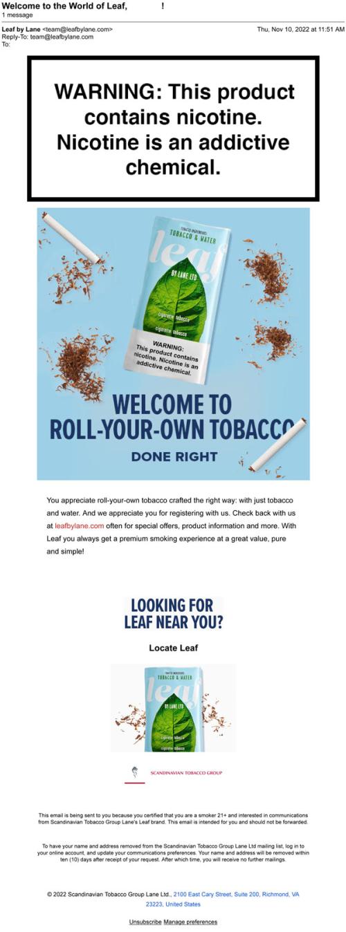 On November 10, 2022, an e-mail from Leaf by Lane welcomes the reader how to roll-your-own tobacco right. Emphasizes appreciation for registering with the brand and provides website information to receive more information and a premium experience with rolling tobacco. Also offers resources to locate Leaf near you.