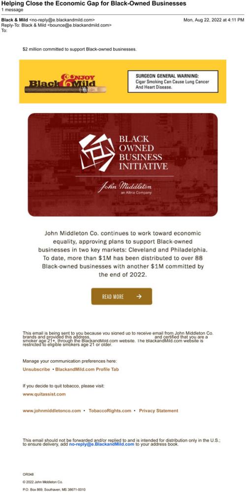 An e-mail from Black & Mild on August 22, 2022, sending the message to recipients the brand is helping close the economic gap for black-owned businesses. Conveys, John Middleton Co. continues to support Black-owned markets located in Cleveland and Philadelphia in efforts to distribute over $1 Million to over 88 Black-owned businesses by the end of 2022. There is a button linked below this description to read more.