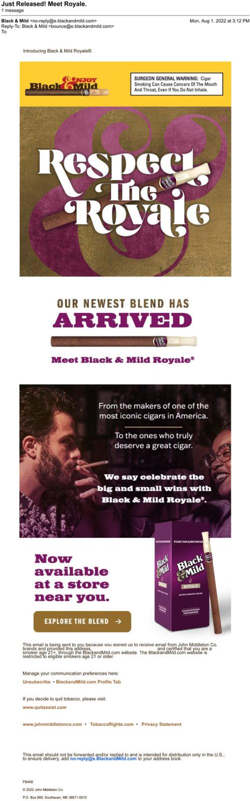 An e-mail from Black & Mild was received on August 1, 2022, promoting the brand's newest blend, the "Black & Mild Royale." It urges customers to explore the new blend, from the " makers of one of the most iconic cigars in America." Pictured in the background is a male and female smiling enjoying the new blend, celebrating big and small wins.