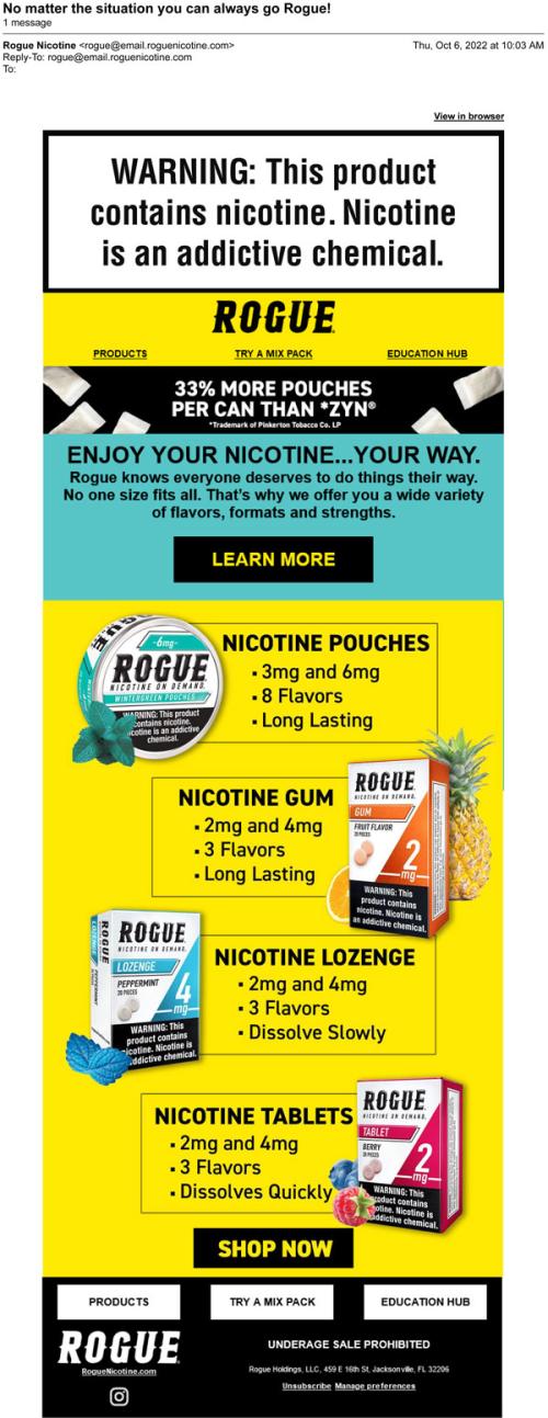 On October 6, 2022, an e-mail from Rogue promotes the phrase, "no matter the situation you can always go Rogue!" It emphasizes to customers to enjoy nicotine your way and that no size fits all. The brand shows a wide variety of flavors, forms and strengths. Pictured are nicotine pouches, gum, lozenge and tablets/ Includes the flavors wintergreen, peppermint, berry, pineapple as well as lists the number of flavor options, strengths of nicotine and how long lasting each Rogue product is.