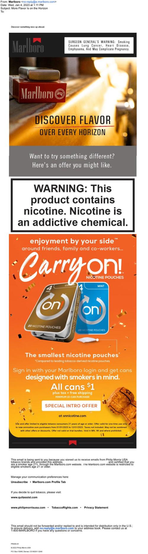 On January 2023, the recipient received an e-mail from Marlboro promoting more flavor is on the horizon by urging customers to try something different as they might like the offer. This leads into the promotion of the brand On! which emphasizes the context "enjoyment by your side around friends, family and co-workers..." featuring the smallest nicotine pouches. The email provides a special intro offer as customers that sign in with Marlboro login can get On! cans that are all $1, specifically "designed with smokers in mind."