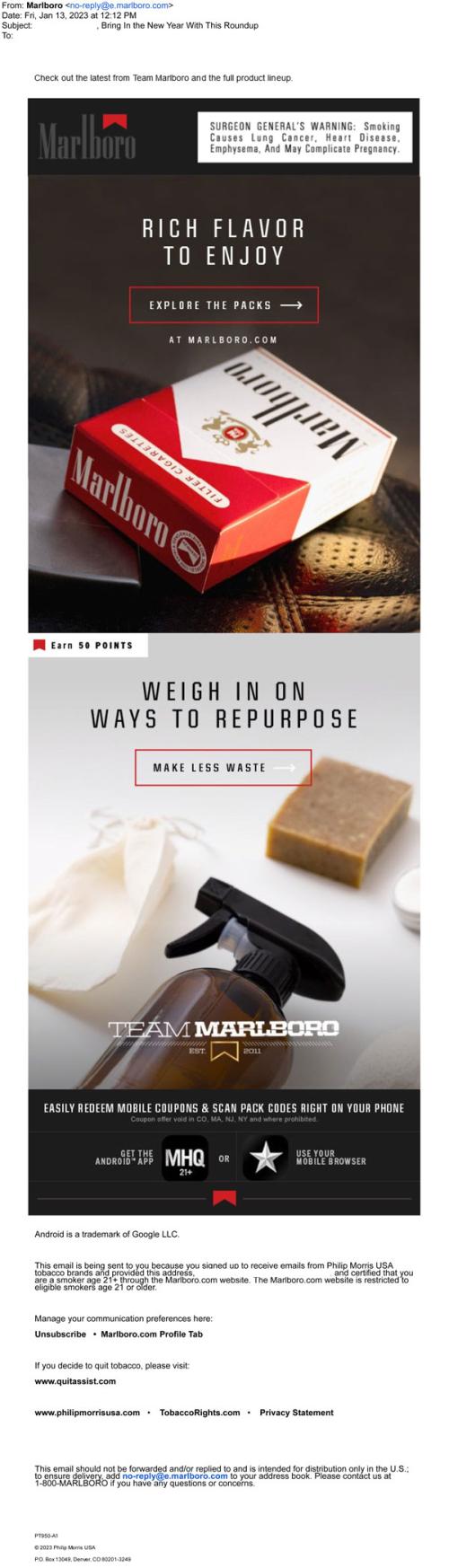 An e-mail from Marlboro January 2023, promoting to bring in the new year with this rich flavor to enjoy. Displays a pack of filtered cigarettes and button linked to explore the packs. Also provides a link to make less waste and encourages the recipient to weigh in on ways to repurpose. Also offers customers to easily redeem the brand's mobile coupons and can pack codes on your phone using the android app or mobile browser.