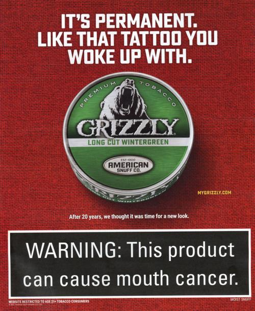 Grizzly magazine ad that announces a new can design in honor of the brand's 20th anniversary. The design now features a roaring Grizzly bear. Includes a link to visit the brand website. Text: "It's permanent. Like that tattoo you woke up with."