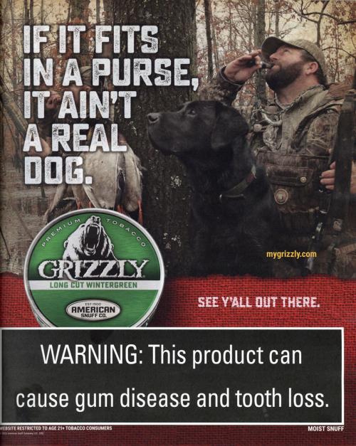 Grizzly magazine ad with a snarky message about hunting dogs: "If it fits in a purse, it ain't a real dog." Has men out duck hunting with a retriever dog.