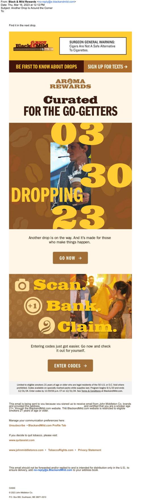 Black & Mild on March 16, 2023 sent an email to recipients promoting another drop is around the corner and is dropping 03/30/23. The new product is "curated for the go-getters" and can use aroma codes to claim rewards. In the background depicts a male smoking cigarillos paired with coffee and coffee beans floating in the background. Another photo pictured of a group of people styling clothing and fashion.
