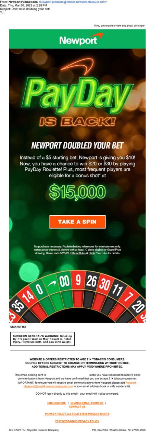 An email on March 30, 2023, Newport reminds recipients to not miss doubling a bet as the brand will double your bet. Describes the chance to win $20 or $30 by playing PayDay Roulette. Also includes the most frequent players are eligible for a bonus shot of potentially receiving $15,000. Provides a take a spin button and in the background is a Roulette wheel.