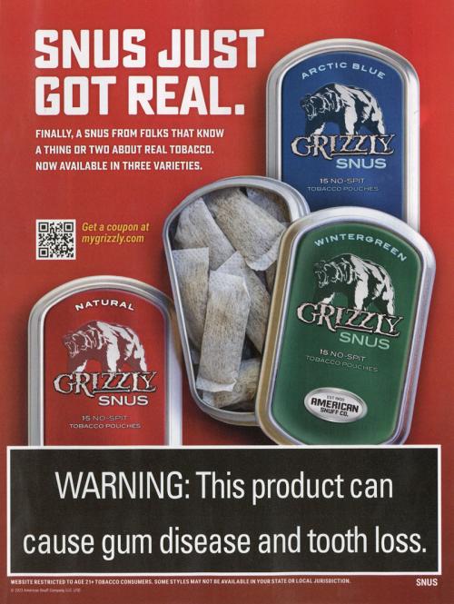 Magazine ad promoting Grizzly snus with imagery of an open can to see the product. Includes a QR code to scan with a mobile device and claim a coupon on the brand website. Text: "Snus just got real. Finally, a snus from folks that know a thing or two about real tobacco. Now available in three varieties."