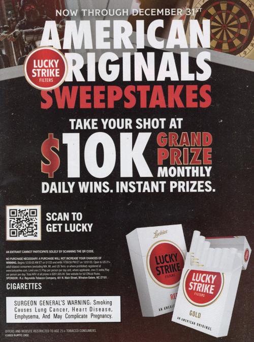 Lucky Strike magazine ad promoting the American Originals sweepstakes, running until the end of the year. The ad promises monthly grand prizes and daily instant wins. Includes a QR code to scan and visit the brand website to enter.