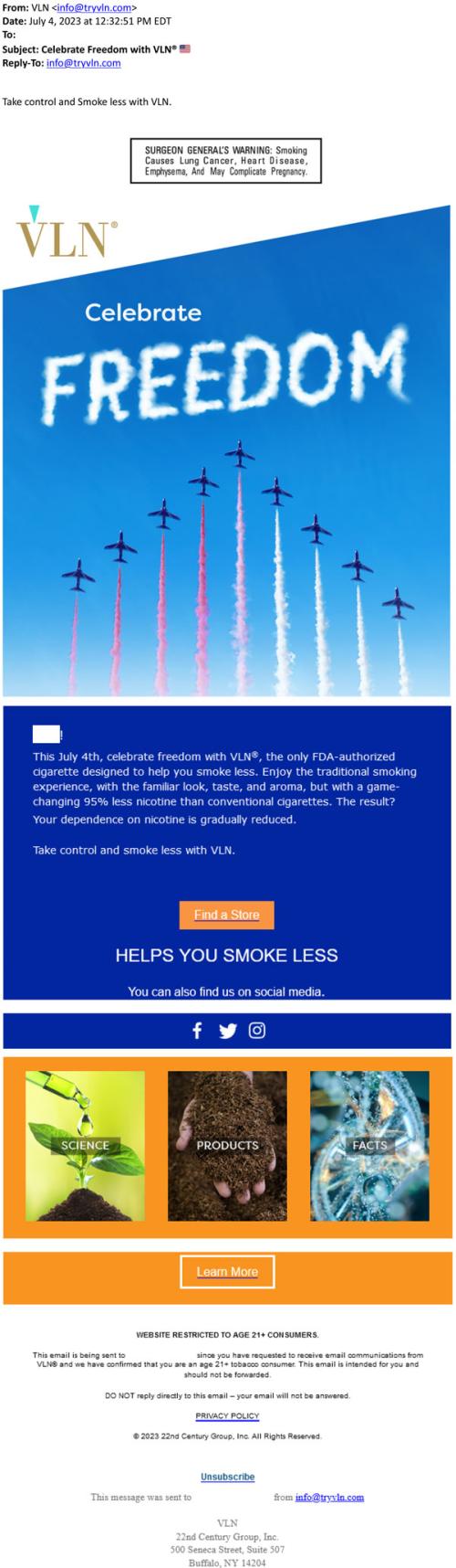 Email from VLN cigarettes in July 2023 for Independence Day. The email reminds the recipient that their product is "the only FDA-authorized cigarette designed to help you smoke less." Provides a link to find a store on the brand website.
