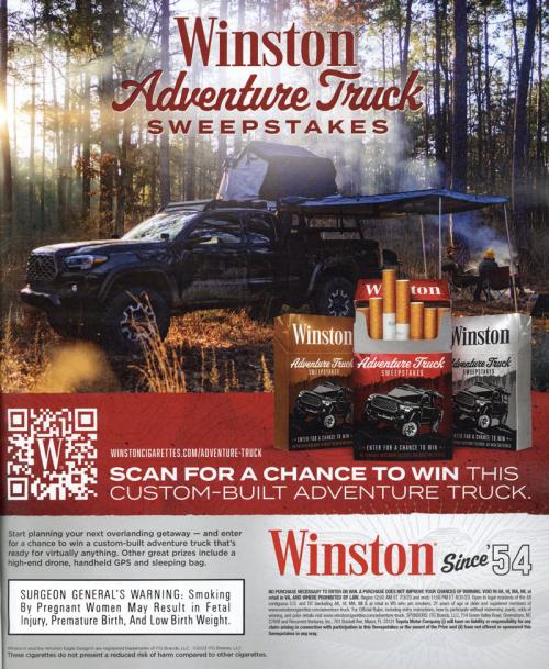 Magazine ad promoting Winston's Adventure Truck Sweepstakes. Includes a QR code to scan to go to the sweepstakes page. Shows new packs with truck imagery on them.