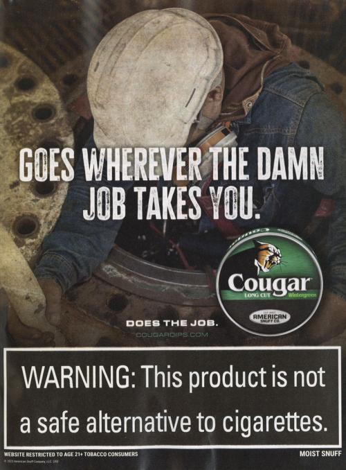 Magazine ad for Cougar smokeless tobacco. Shows a blue collar worker going underground via a manhole. Text: "Goes wherever the damn job takes you."