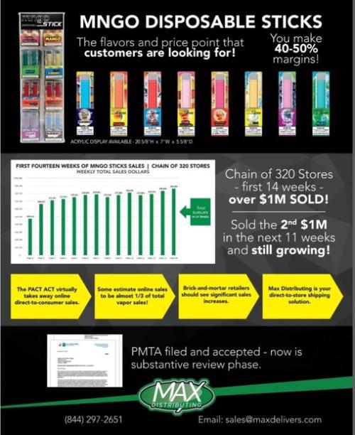 Business-to-business magazine ad for MNGO disposable vape products, including imagery and wording letting the viewer know that their PMTA is accepted by the FDA and is in the substantive review phase.