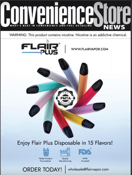 Business-to-business magazine ads for Flair Plus and Flair Infinity disposable vape products, including the FDA logo and a stamp announcing that their PMTA was accepted by