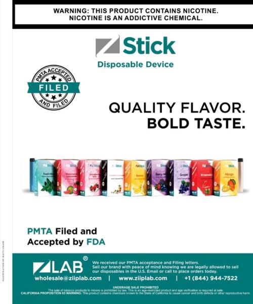 Business-to-business magazine ad for disposable vape products by Z Stick, including text  and a stamp image announcing that their PMTA has been "filed and accepted" by FDA.