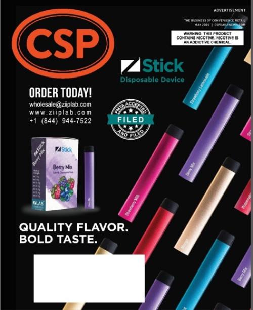 Business-to-business magazine ads for disposable vape products by Z Stick, including stamp imagery announcing that their PMTA has been accepted and filed; one ad even shows that their products are undergoing "scientific substantial review" in the FDA process.