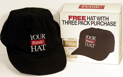 Free hat with three pack purchase: Hat is black, "Your Basic Hat", white box. Cigarette packs inside. Packs of "Basic Light".