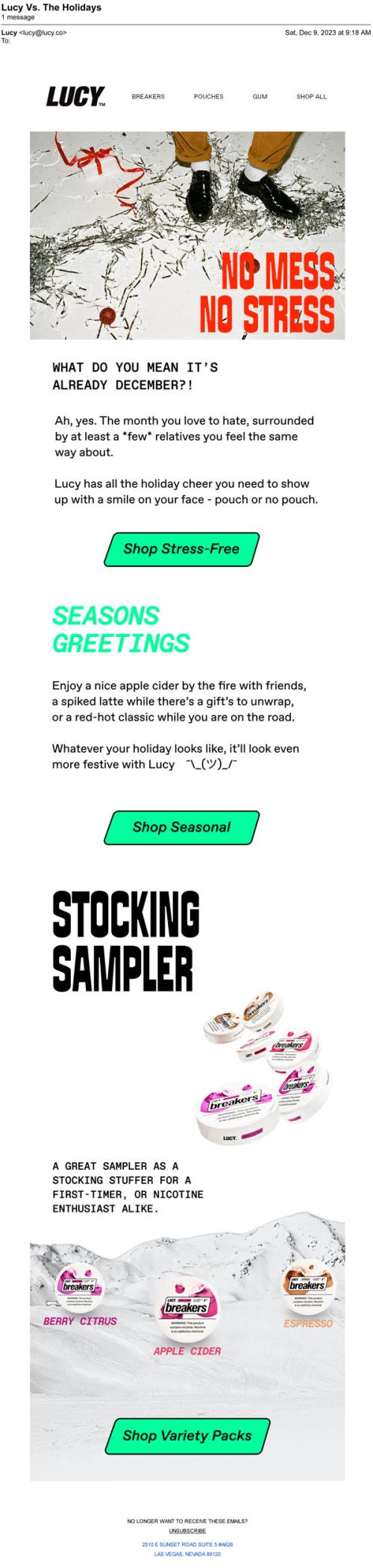 Email from Lucy in December 2023 promoting their nicotine pouch products for less stress during the holidays. They also promote their flavor sampler packs as stocking stuffers; links to the brand website shop to purchase.