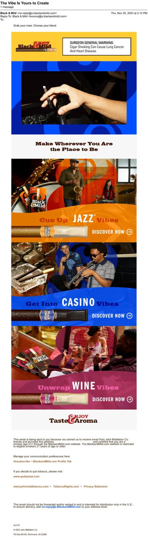 Email from Black & Mild in November 2023 promoting various cigar blends and linking to the brand website to learn more about the vibes. Includes an animated image that shows groups of people socializing and smoking.