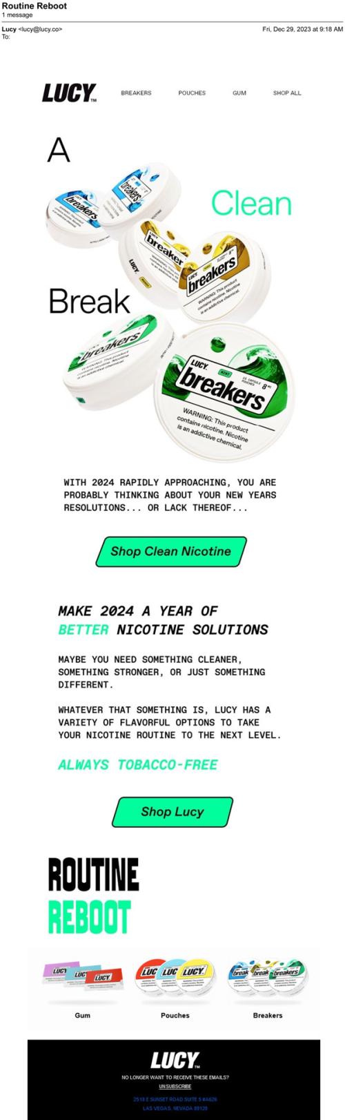 Email from Lucy in December 2023 promoting their nicotine pouch products and flavor selection, using the word 'clean' to market their nicotine.